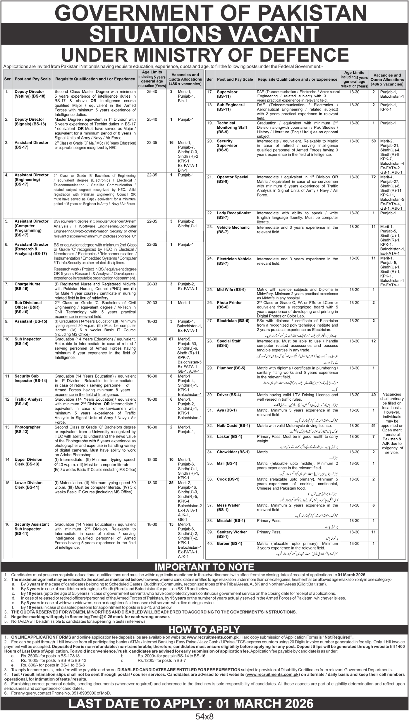 Government of Pakistan has announced multiple vacancies under the Ministry of Defence.