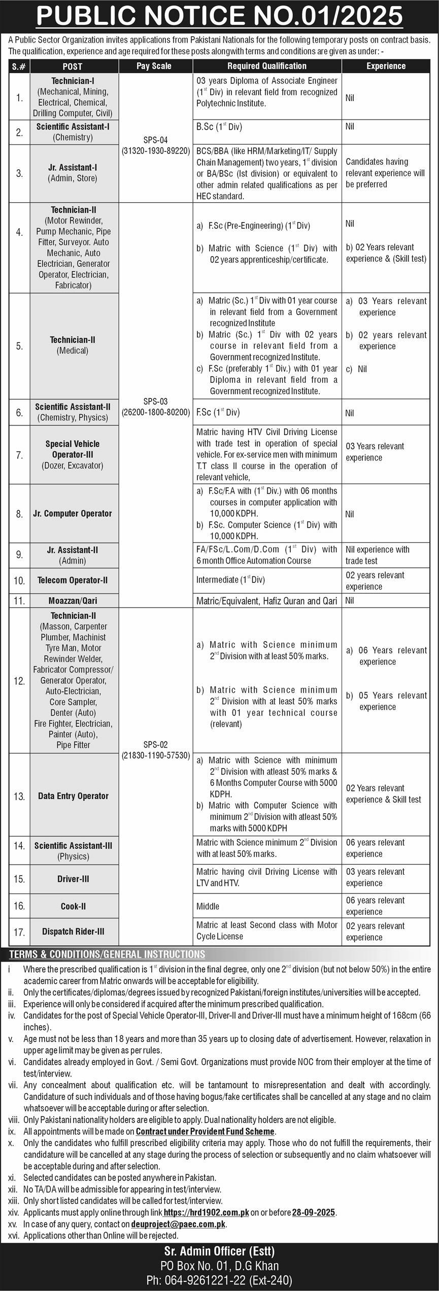 PAEC is hiring for various positions, and applications must be submitted online by September 28, 2025. The available posts include Technician, Scientific Assistant, Junior Assistant, Data Entry Operator, and several others. The jobs are temporary on a contract basis, but are extendable up to the age of superannuation (60 years).