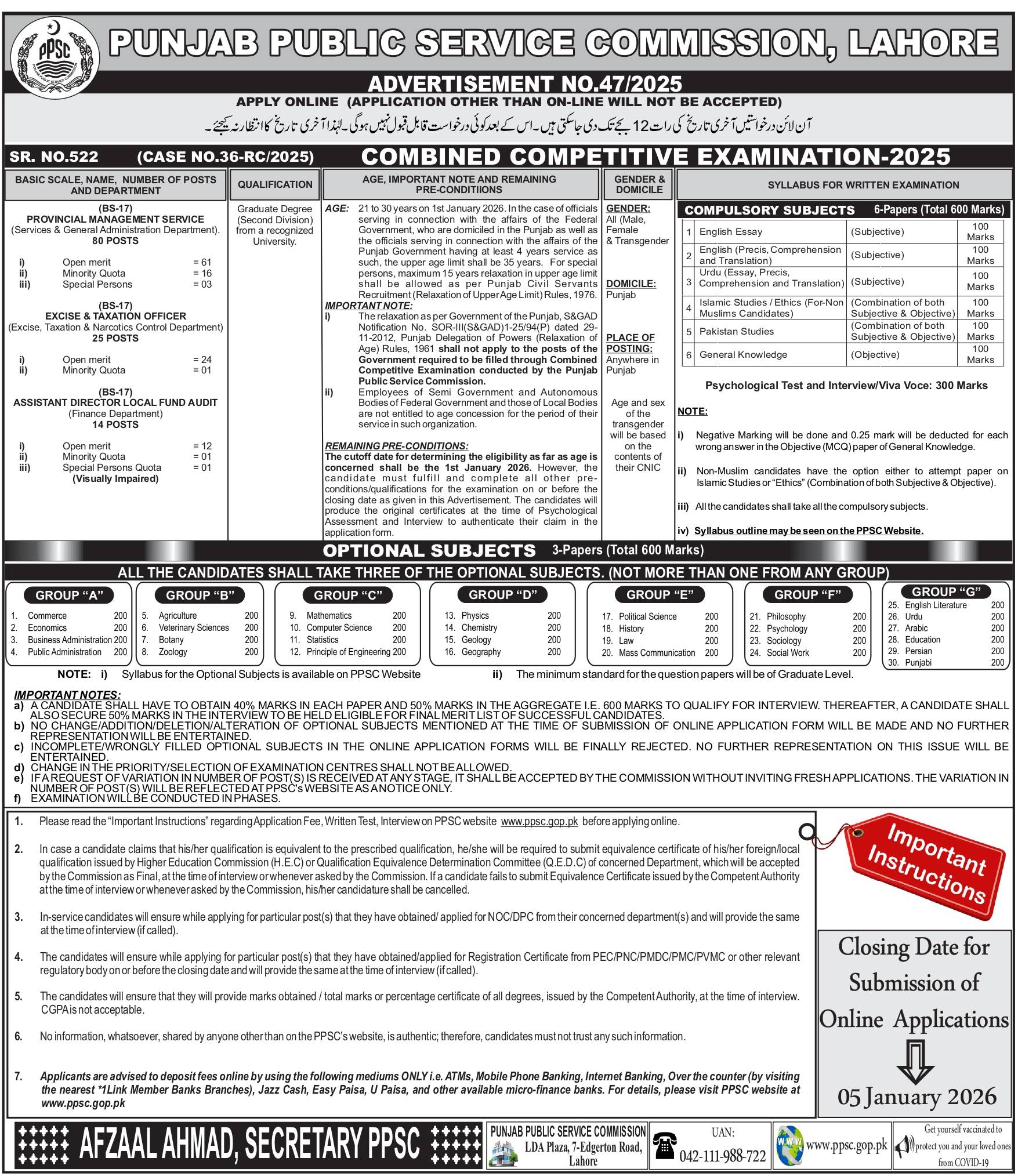 Candidates must select three optional subjects (not more than one from each group) as per PPSC list.