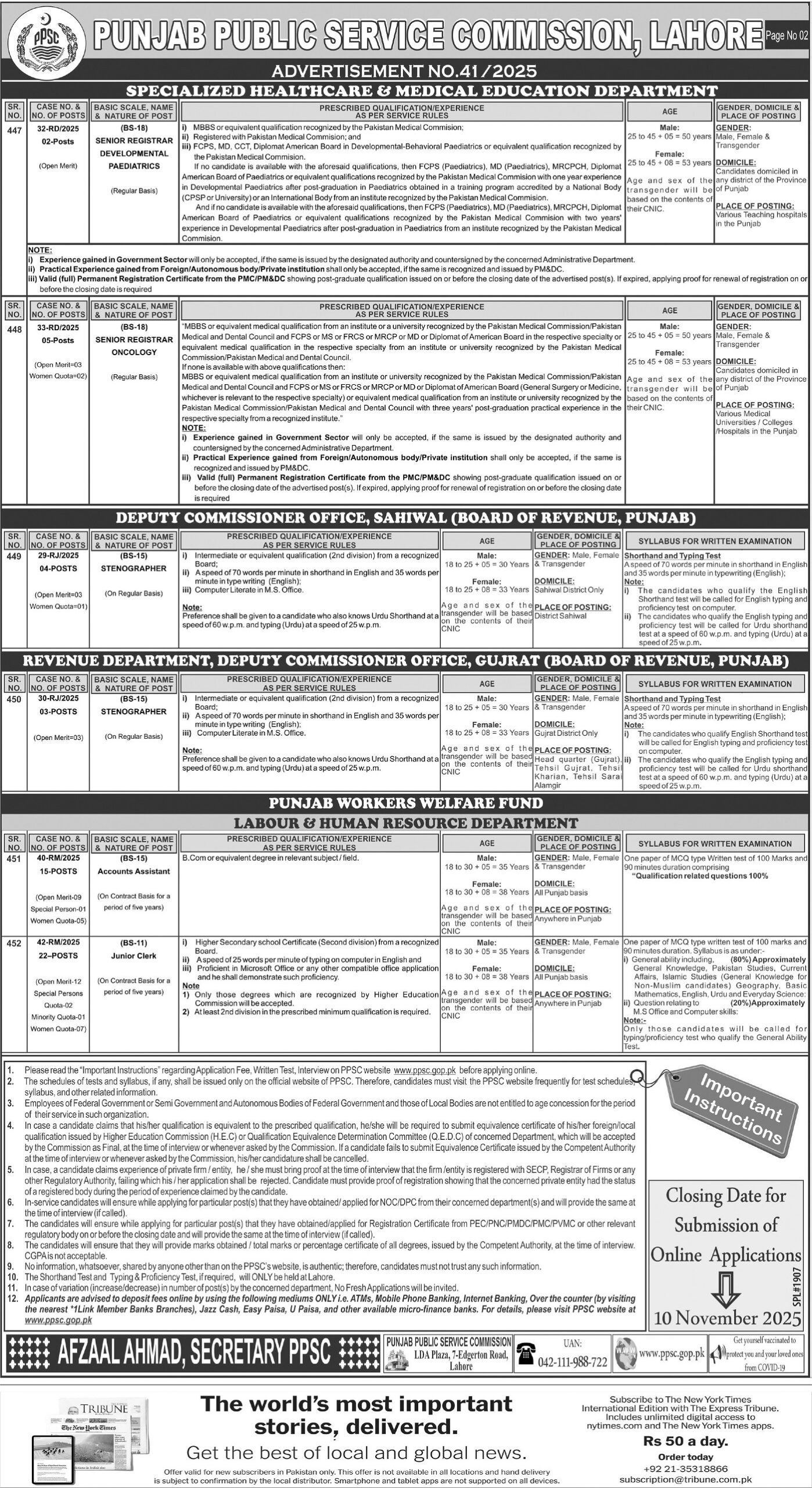 The Punjab Workers Welfare Fund (Labour & Human Resource Department) invites applications from Pakistani Nationals for the following posts on a Contract Basis for a period of five years. The closing date for submission of online applications is 10 November 2025.
