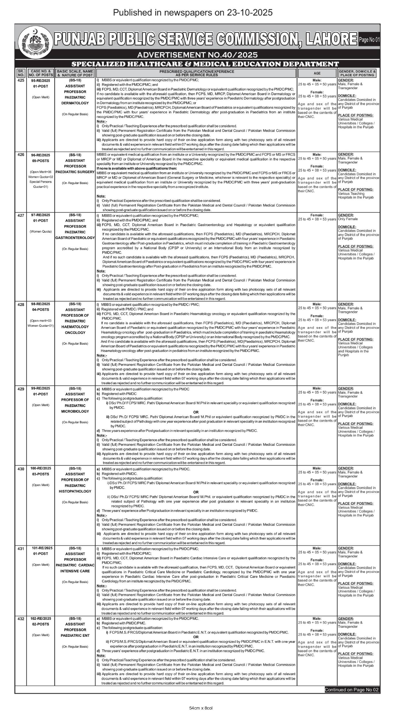 • Qualification: MBBS / PMDC/PMC Registration + FCPS, MD, CCT, Diplomat American Board in Paediatric Dermatology or equivalent. Alternate qualifications with relevant post-graduation experience are also detailed.